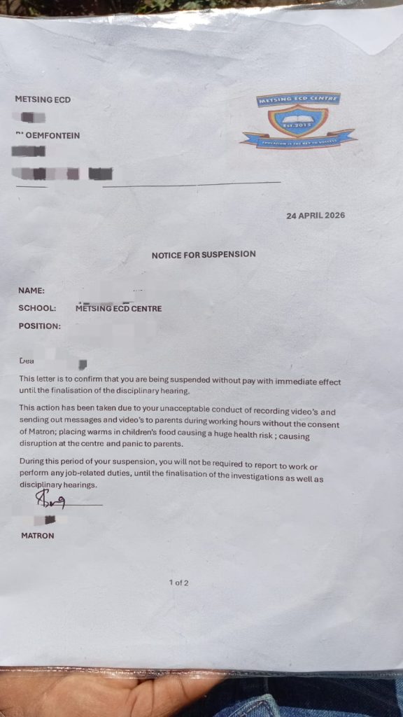 According to a parent who spoke with Free State World, the issue was initially brought to their attention by staff members at the ECD Centre who reported the discovery of worms in food intended for the children. Attempts to communicate with the Matron of the Centre to address these concerns have allegedly been met with evasion, as parents claim she often avoids meetings and is difficult to reach, even allegedly switching off her phone at scheduled times.